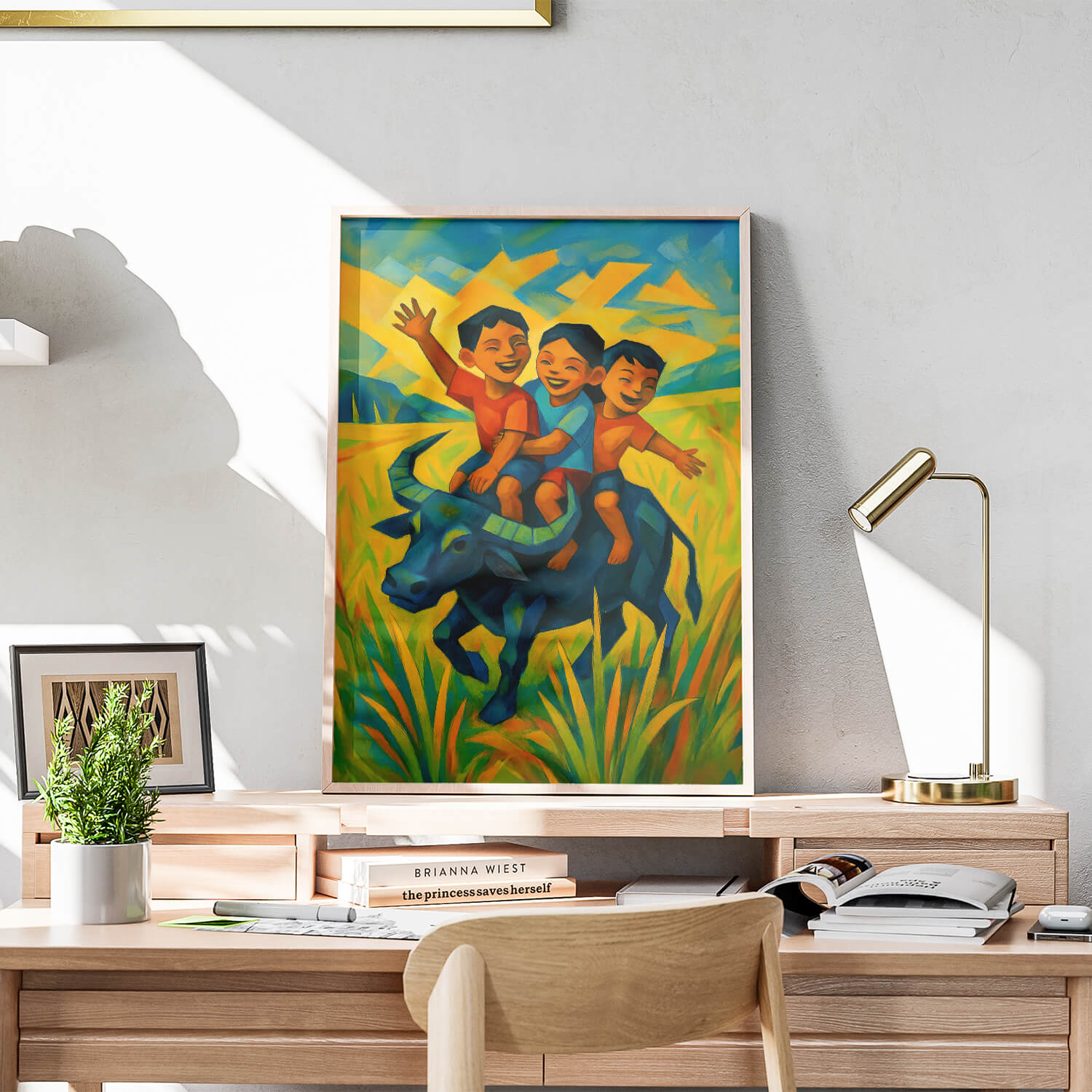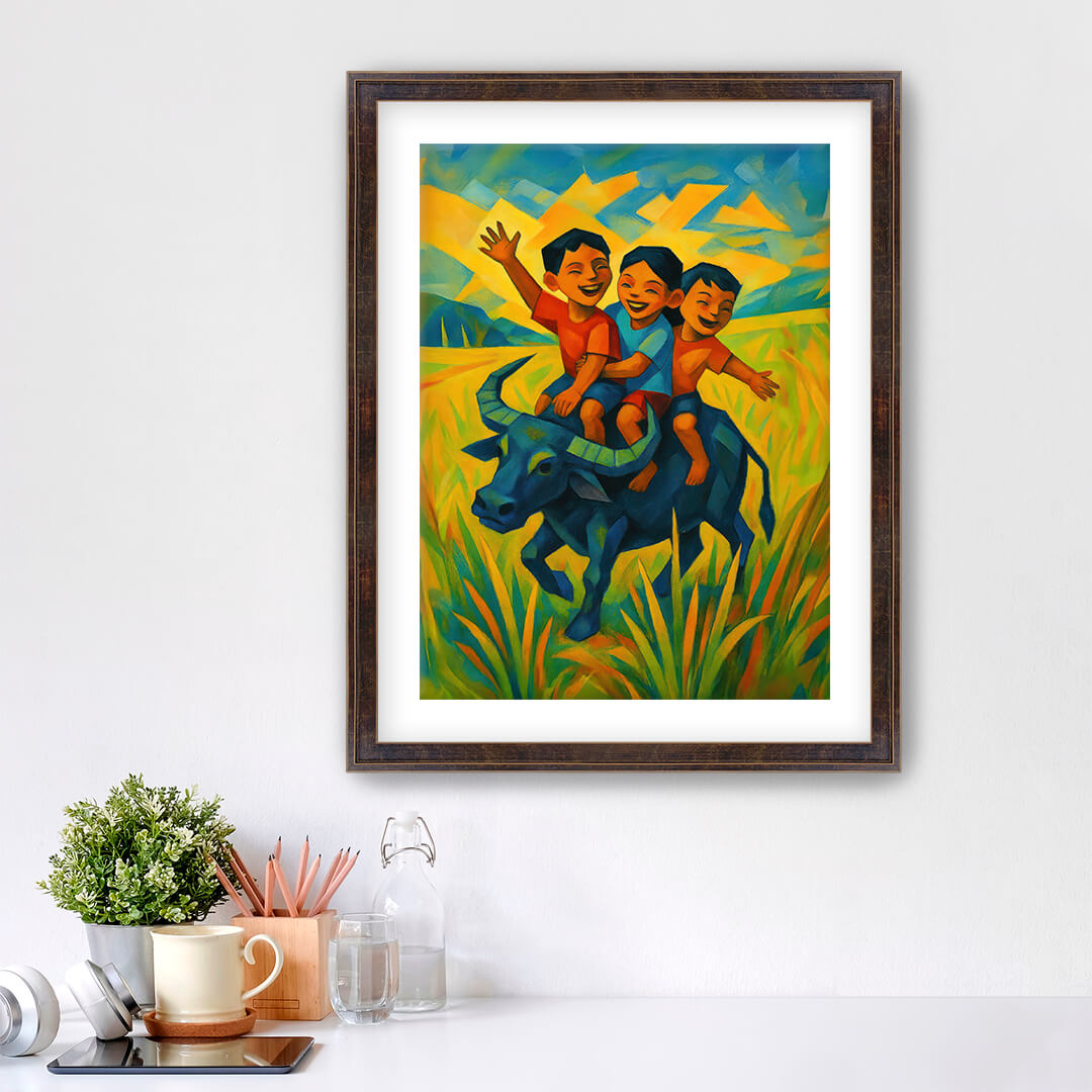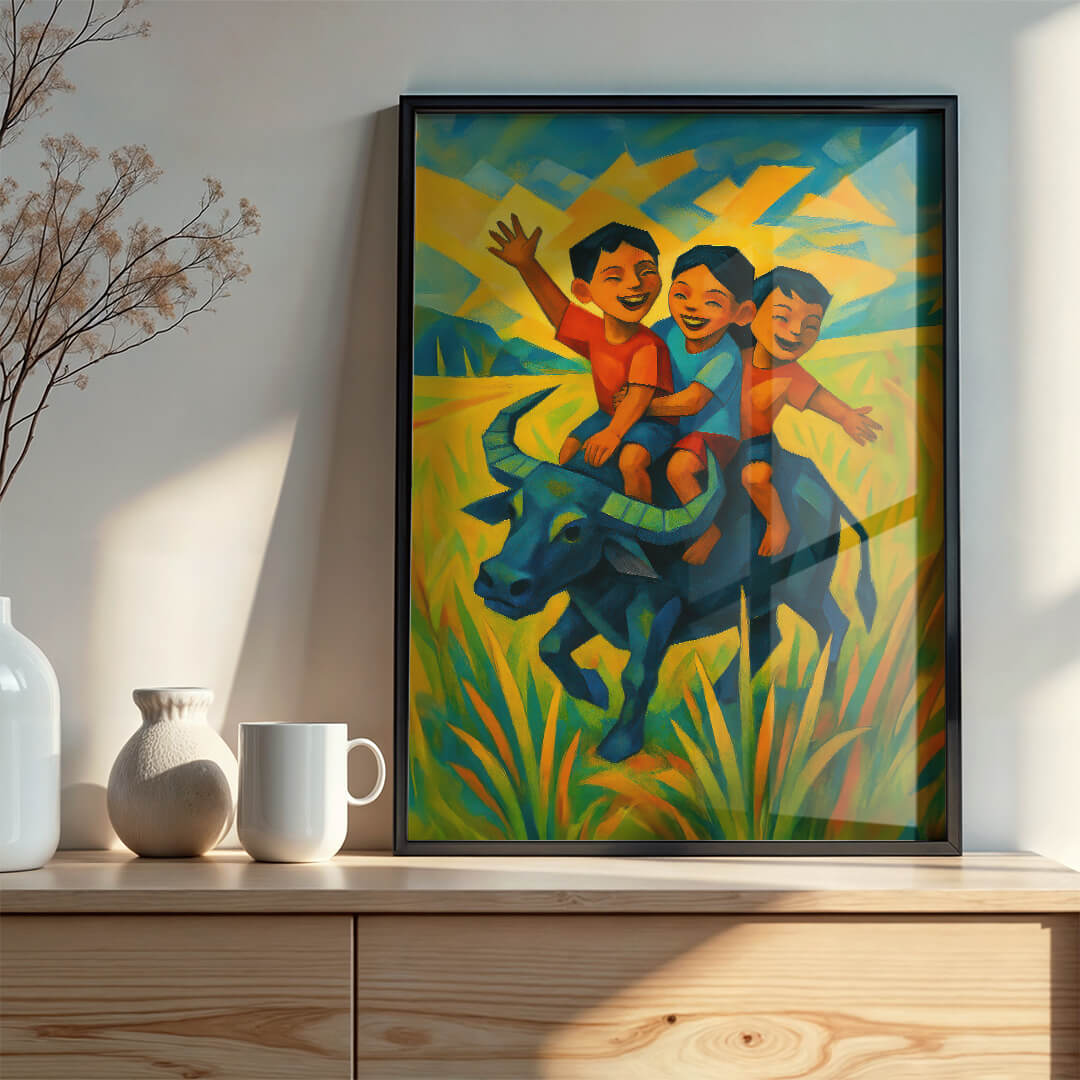 Celebrate the warmth of Filipino rural life with this heartwarming artwork of Filipino kids riding a Carabao through lush green rice fields—a joyful pastime deeply rooted in countryside tradition. This piece captures a simple yet powerful moment: laughter, friendship, and a strong bond with nature and the hardworking Carabao, the Philippines’ “Beast of Burden.”