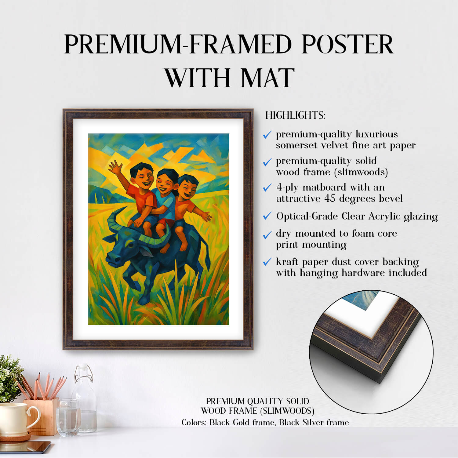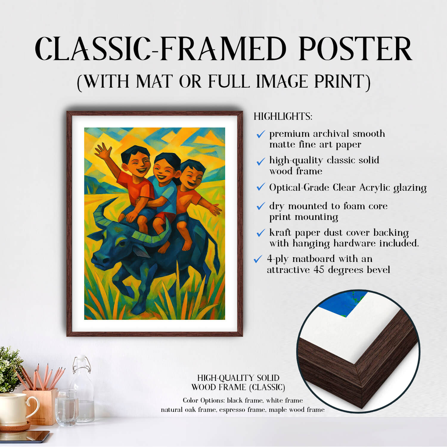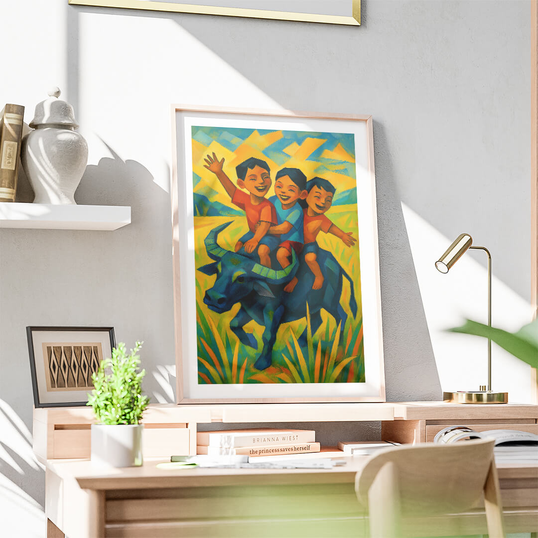 Celebrate the warmth of Filipino rural life with this heartwarming artwork of Filipino kids riding a Carabao through lush green rice fields—a joyful pastime deeply rooted in countryside tradition. This piece captures a simple yet powerful moment: laughter, friendship, and a strong bond with nature and the hardworking Carabao, the Philippines’ “Beast of Burden.”