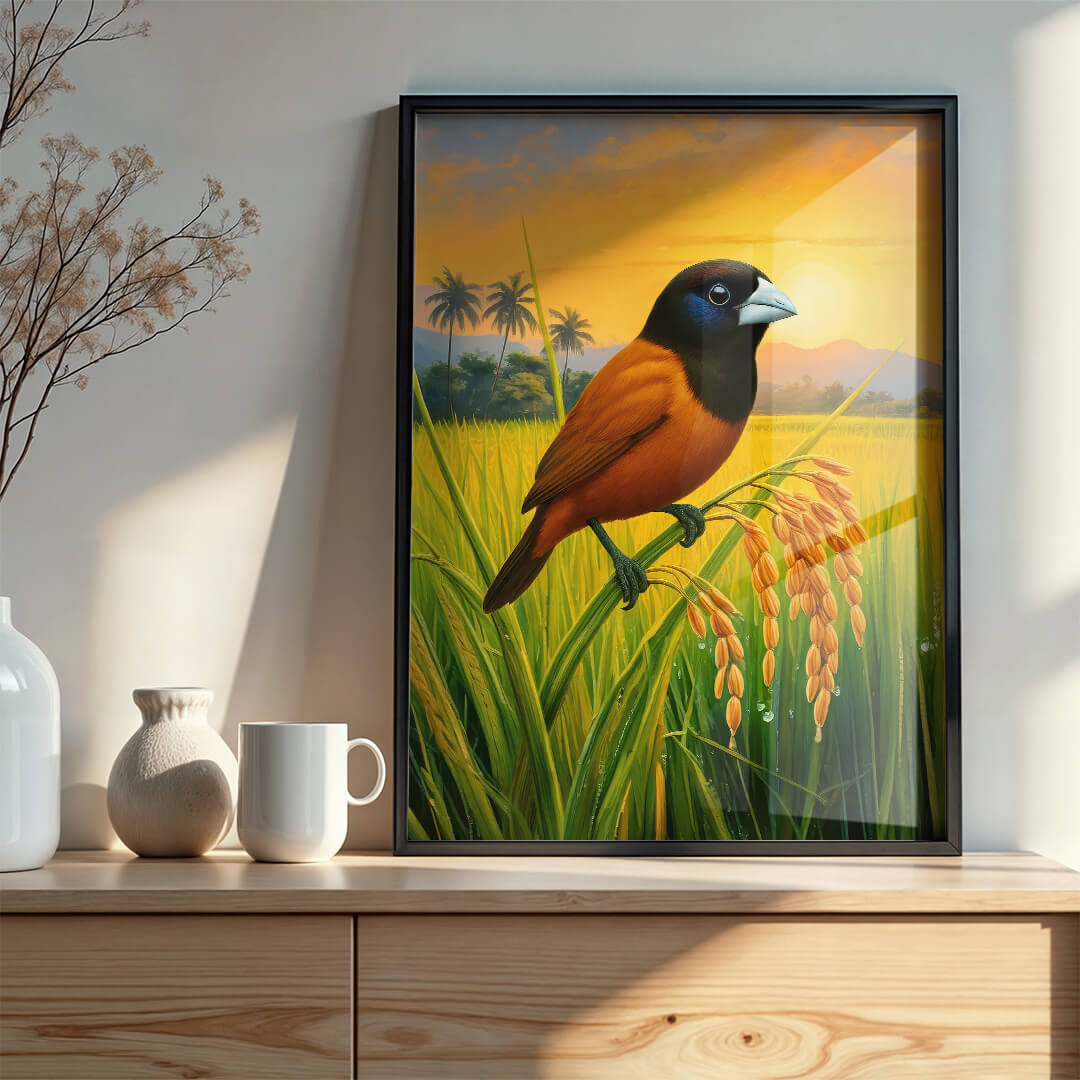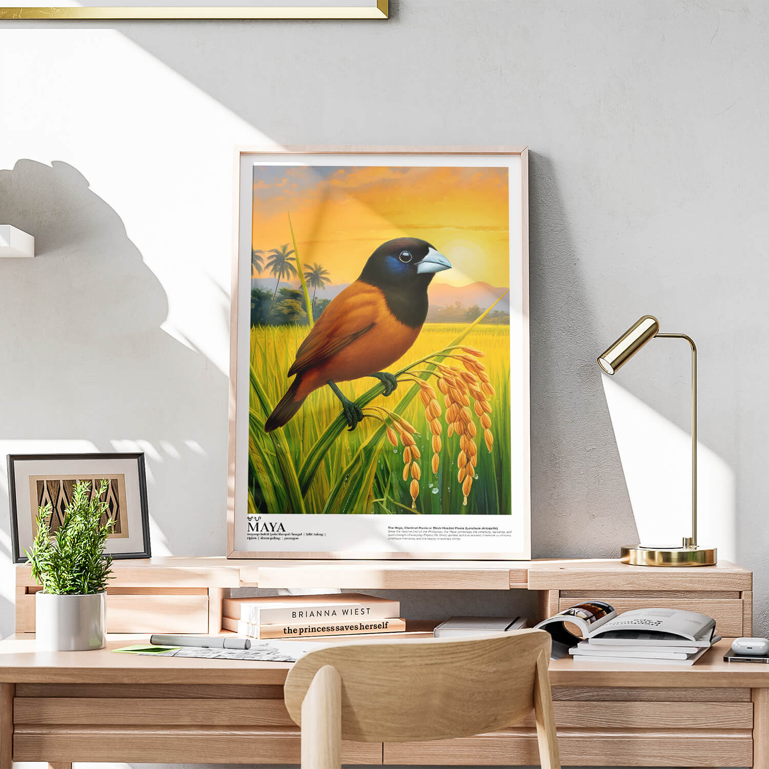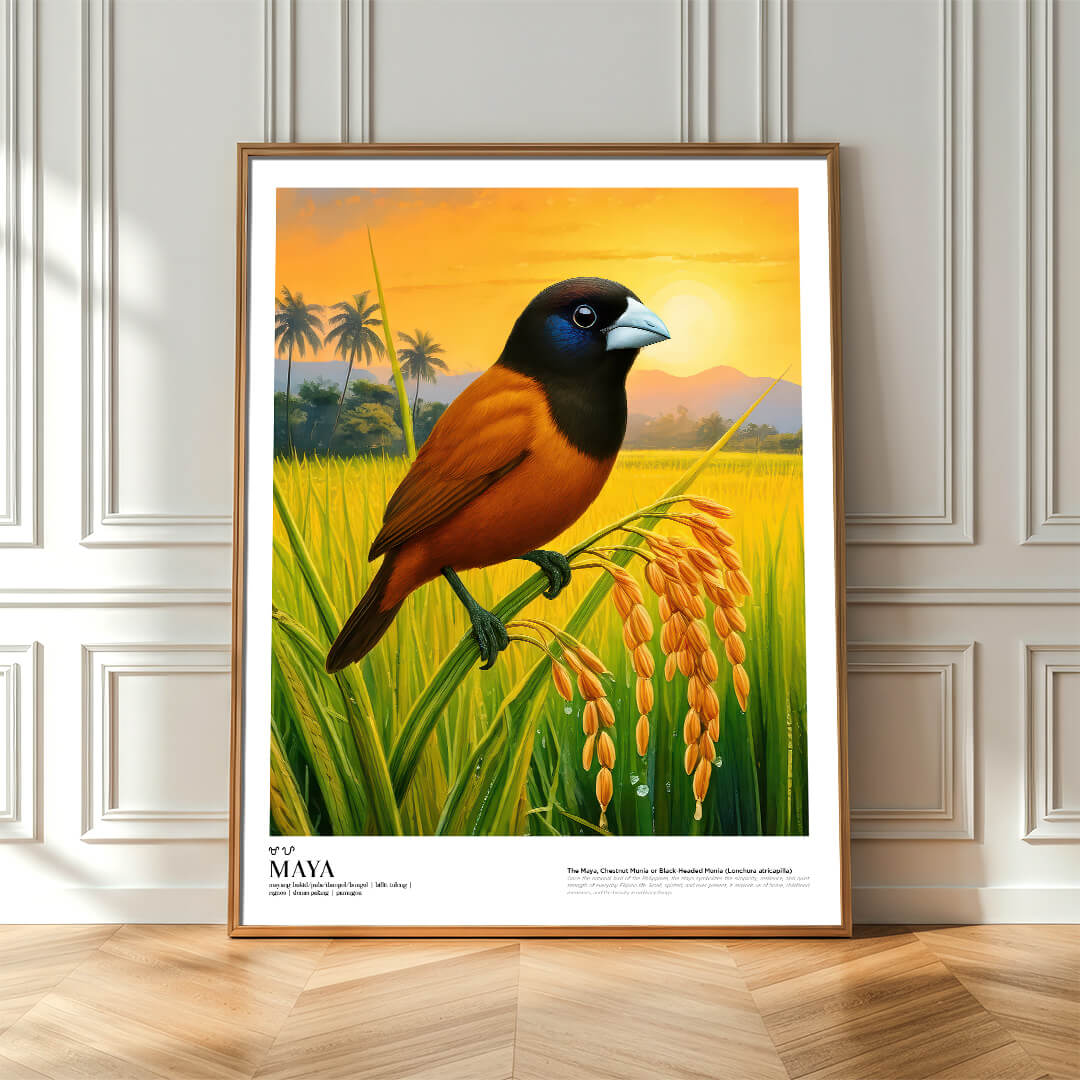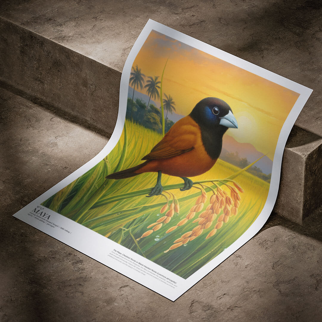 Celebrate the quiet beauty of simplicity with this artwork of the Maya, the Philippines’ once national bird and a beloved symbol of everyday Filipino life. Known scientifically as Lonchura atricapilla, the Maya—also called the Chestnut Munia or Black-Headed Munia—is a small, social bird often seen flitting among rice fields, backyard trees, and village rooftops.
