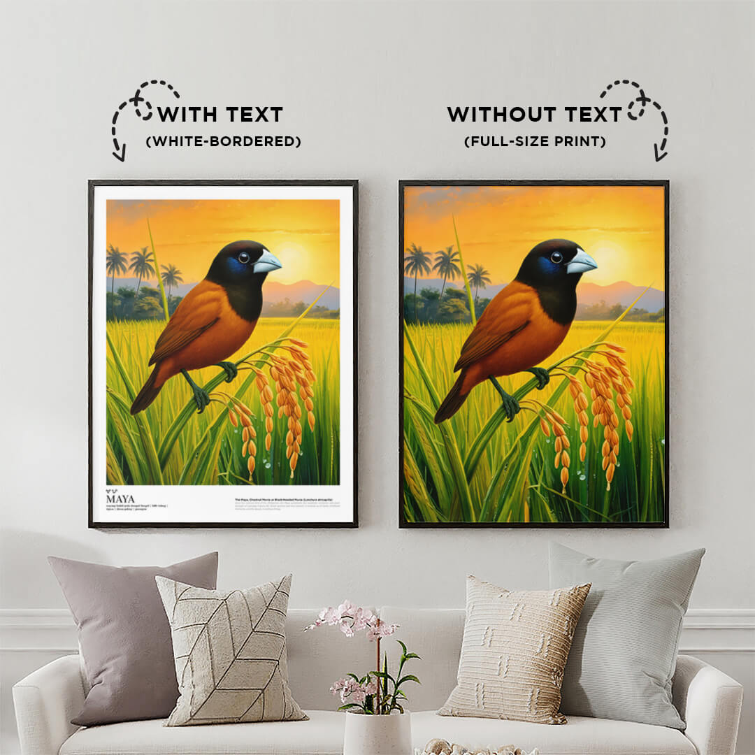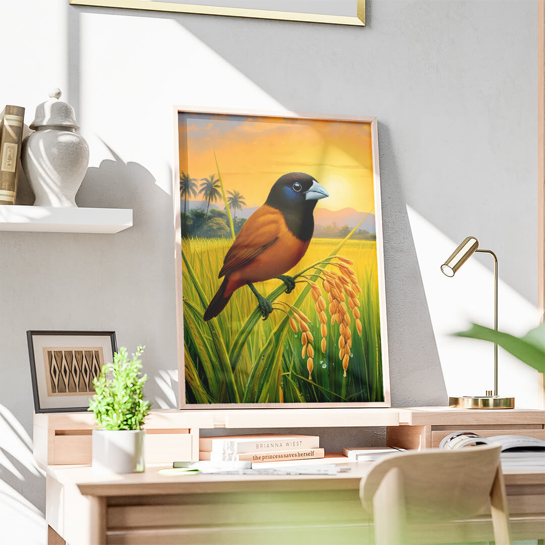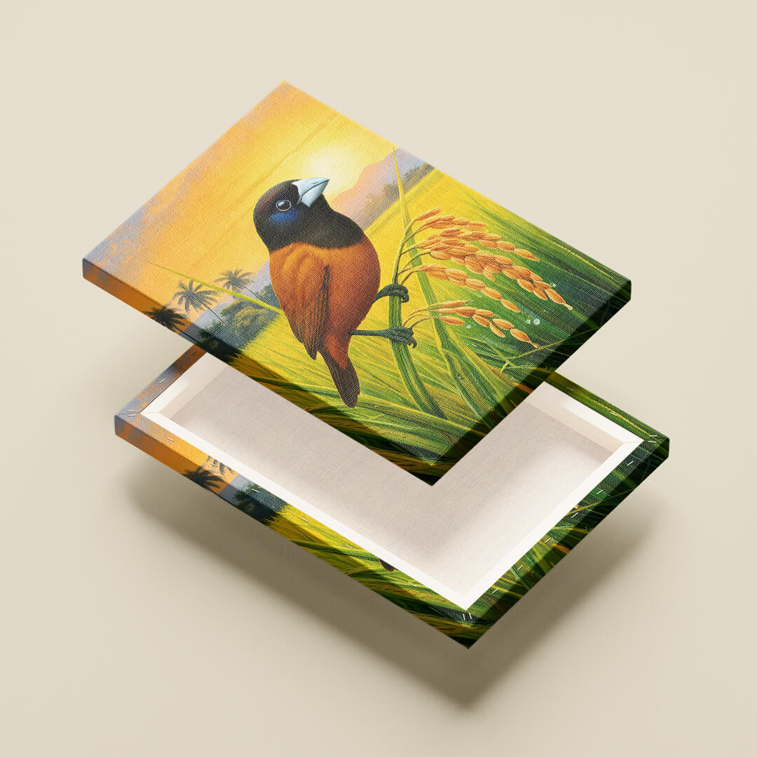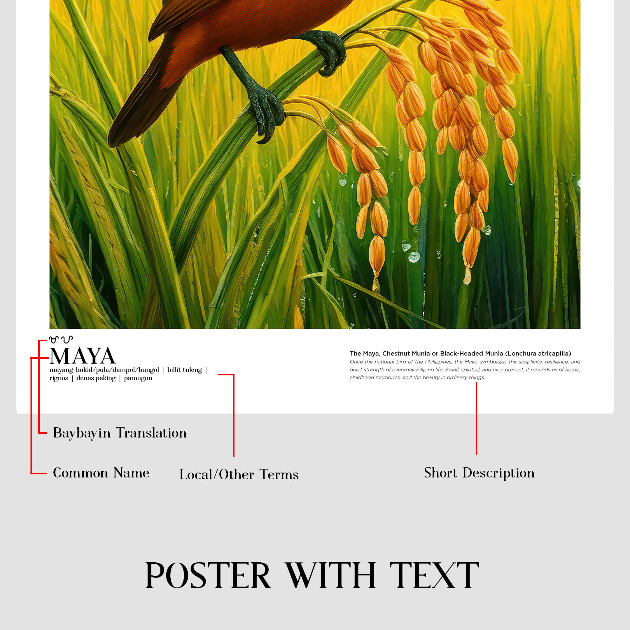 Celebrate the quiet beauty of simplicity with this artwork of the Maya, the Philippines’ once national bird and a beloved symbol of everyday Filipino life. Known scientifically as Lonchura atricapilla, the Maya—also called the Chestnut Munia or Black-Headed Munia—is a small, social bird often seen flitting among rice fields, backyard trees, and village rooftops.