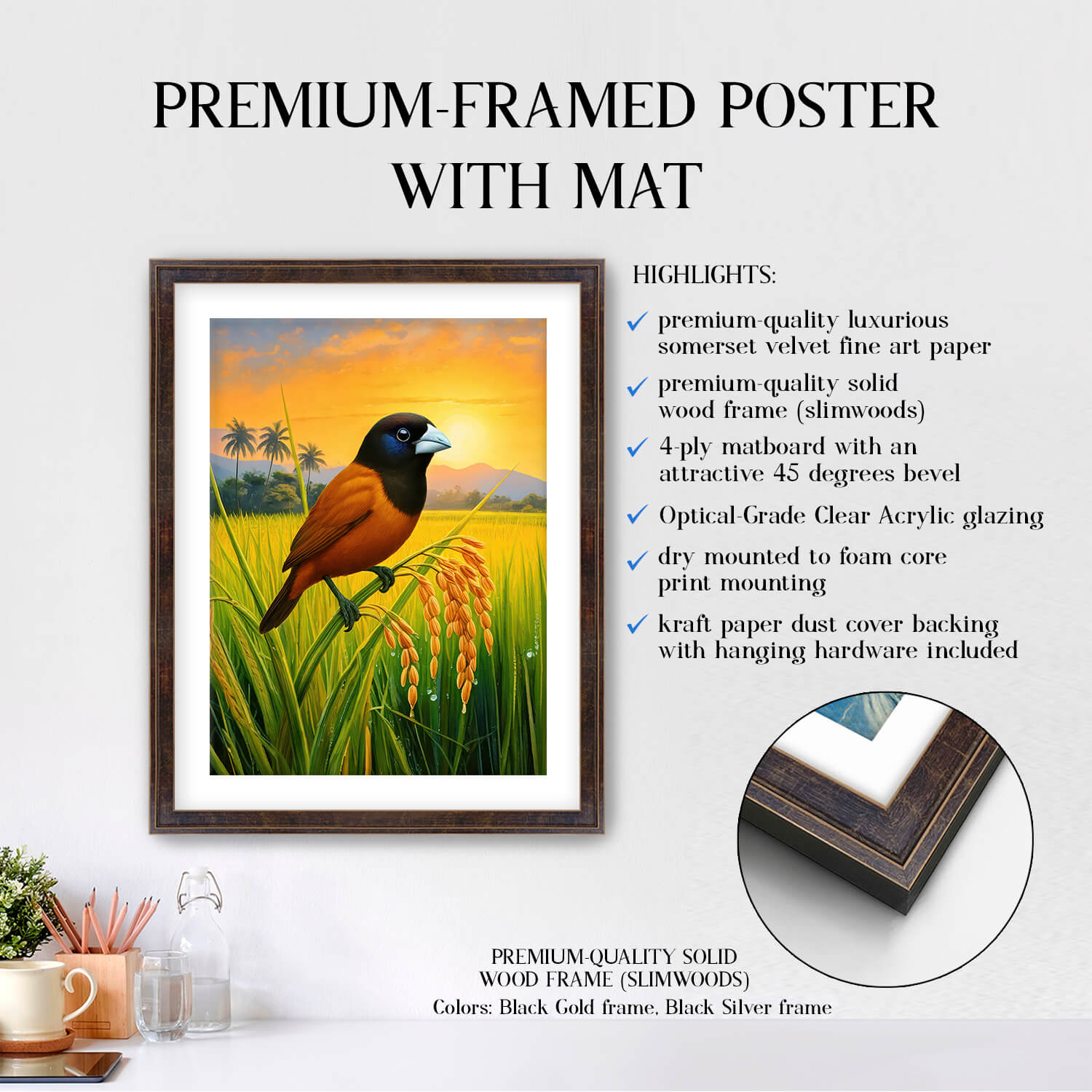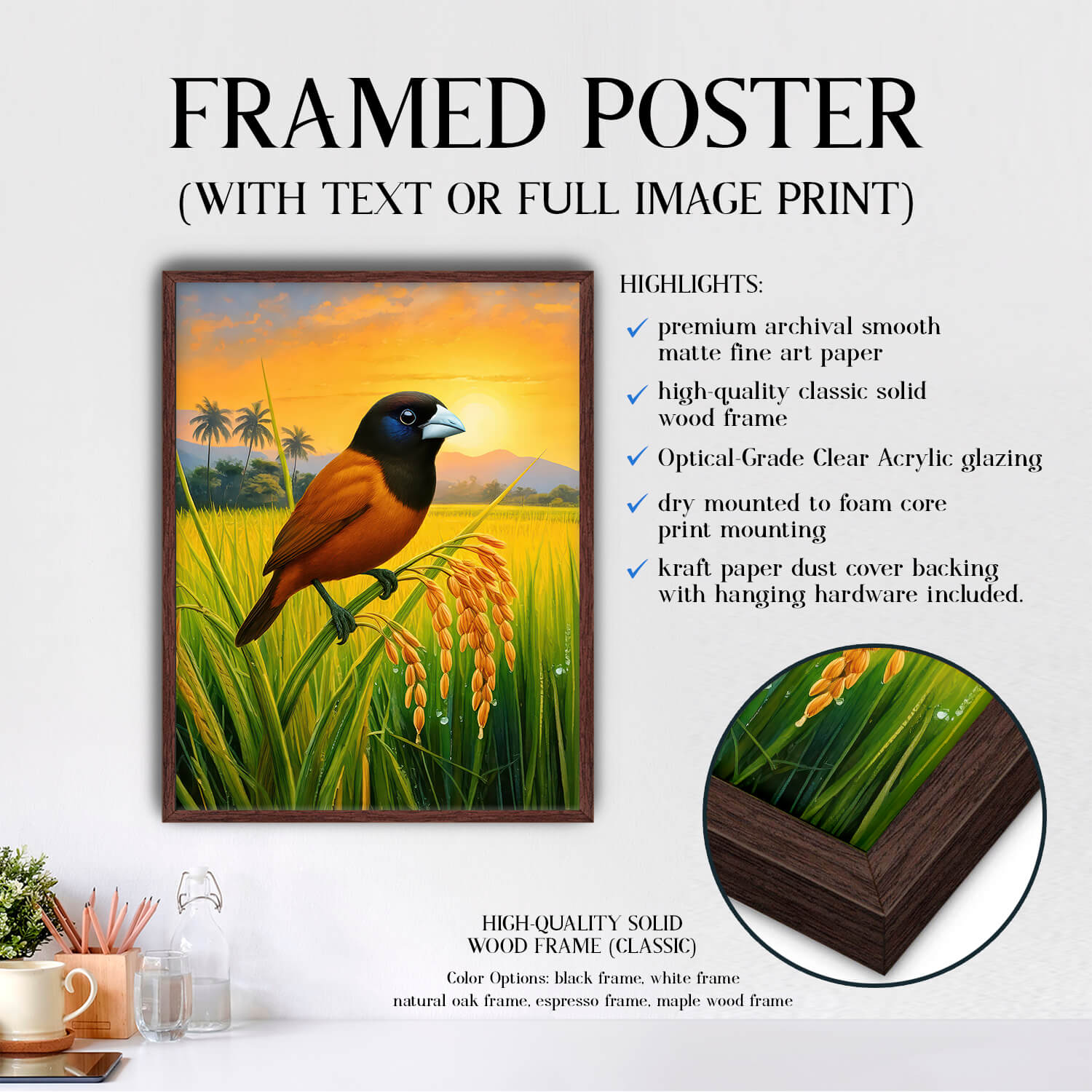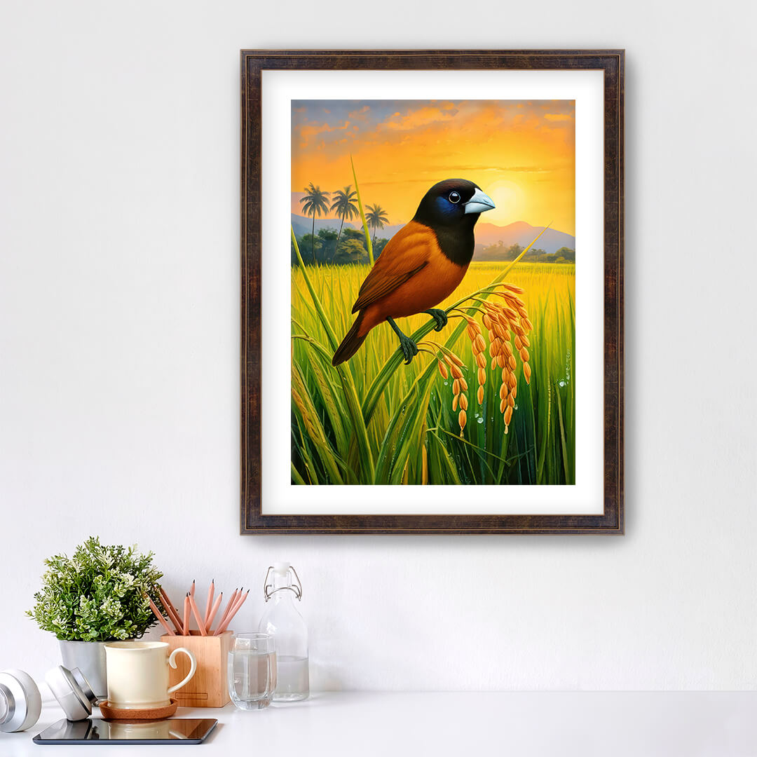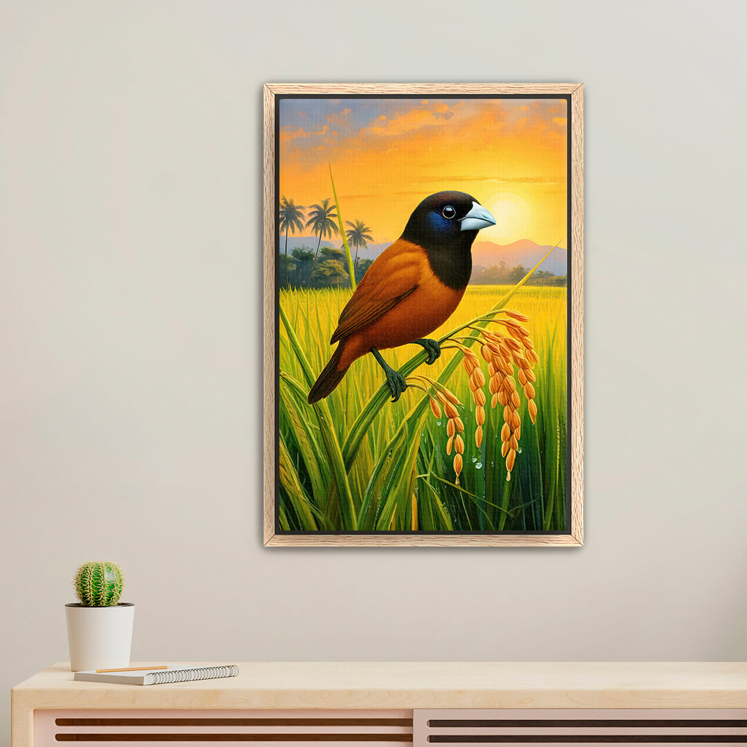 Celebrate the quiet beauty of simplicity with this artwork of the Maya, the Philippines’ once national bird and a beloved symbol of everyday Filipino life. Known scientifically as Lonchura atricapilla, the Maya—also called the Chestnut Munia or Black-Headed Munia—is a small, social bird often seen flitting among rice fields, backyard trees, and village rooftops.
