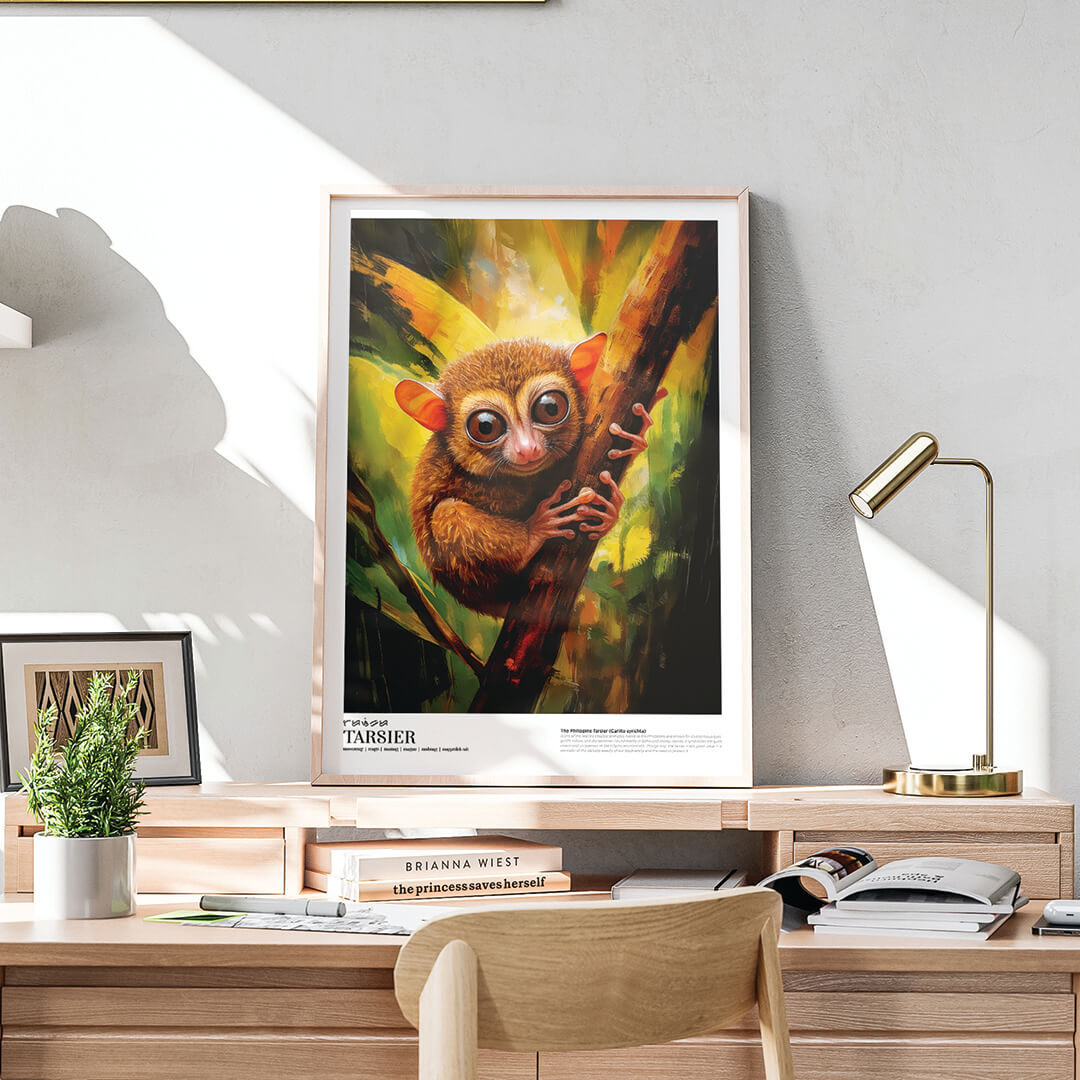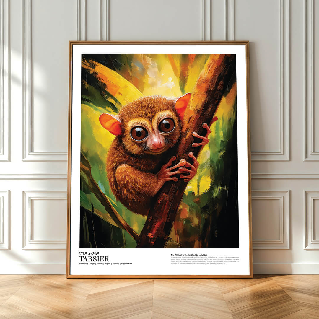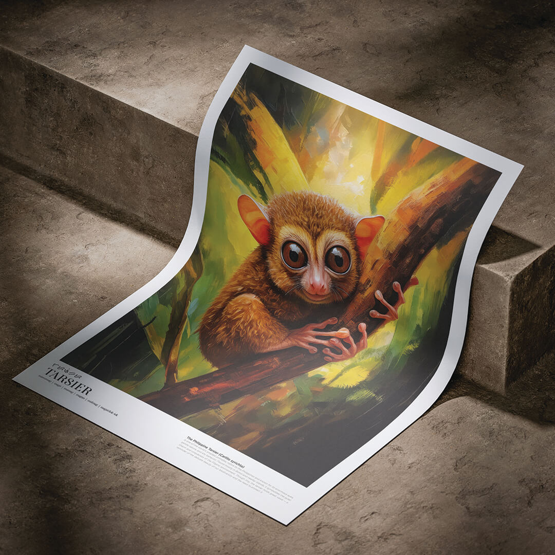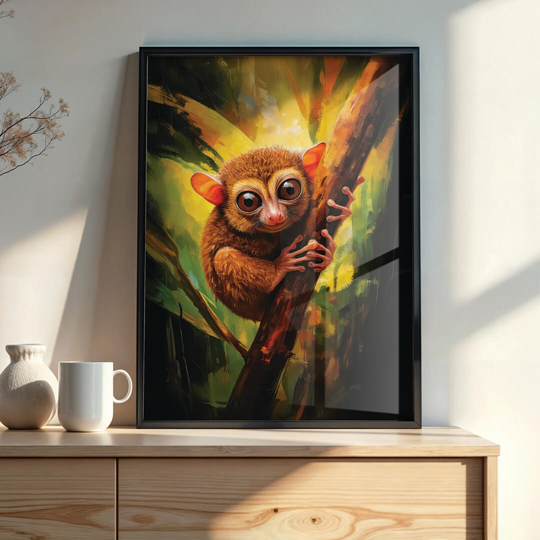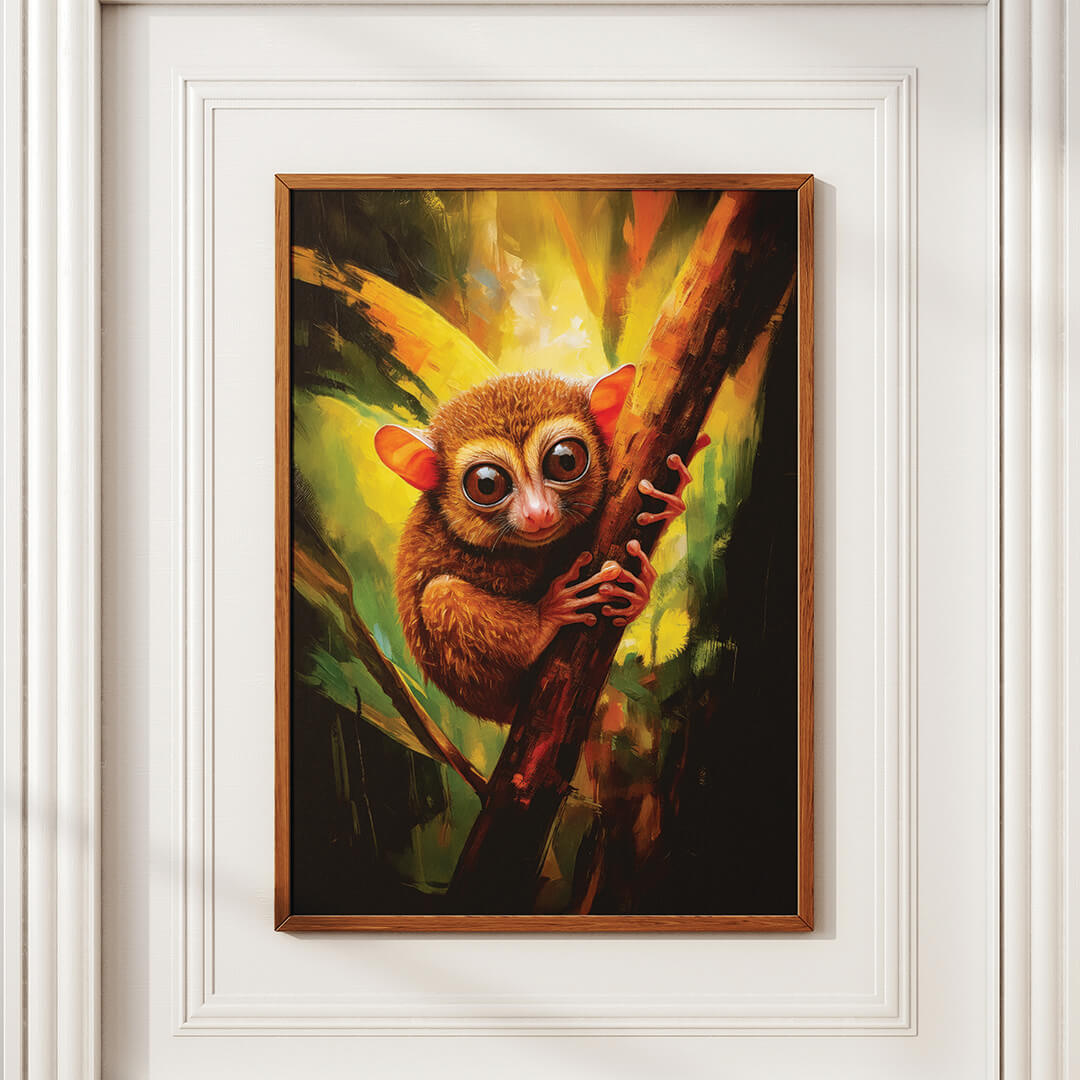 Often hidden in the underbrush and tree hollows, the tarsier is a quiet guardian of the night and a living link to the ancient evolutionary past. This piece of artwork featuring the tarsier offers more than charm—it promotes awareness and protection for this near-threatened species and its fragile habitat.