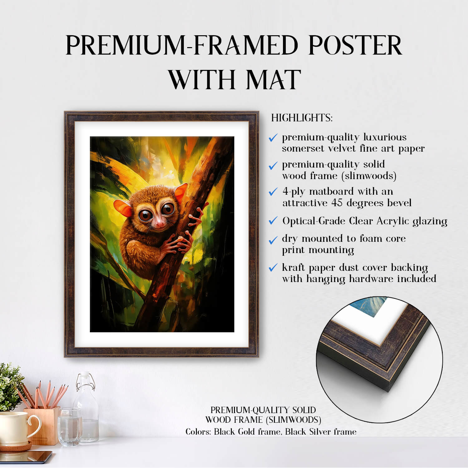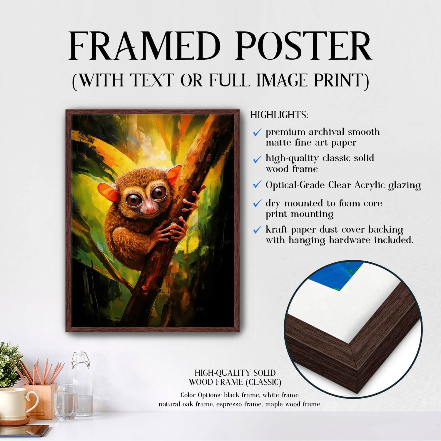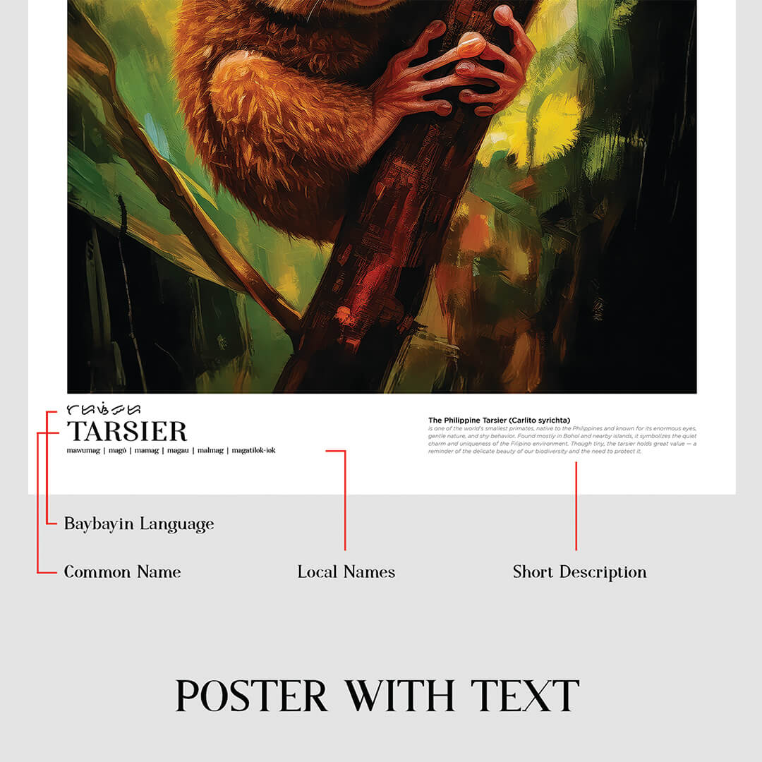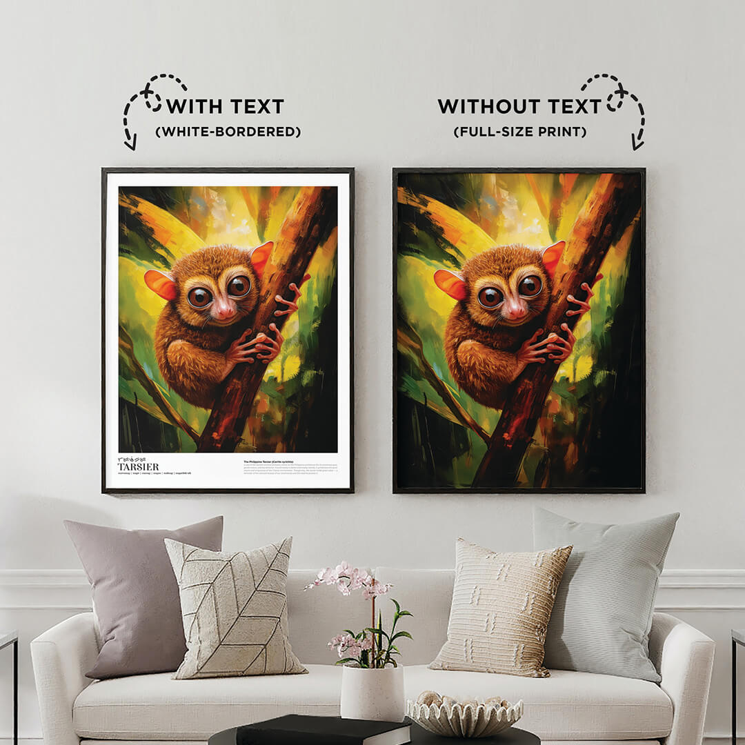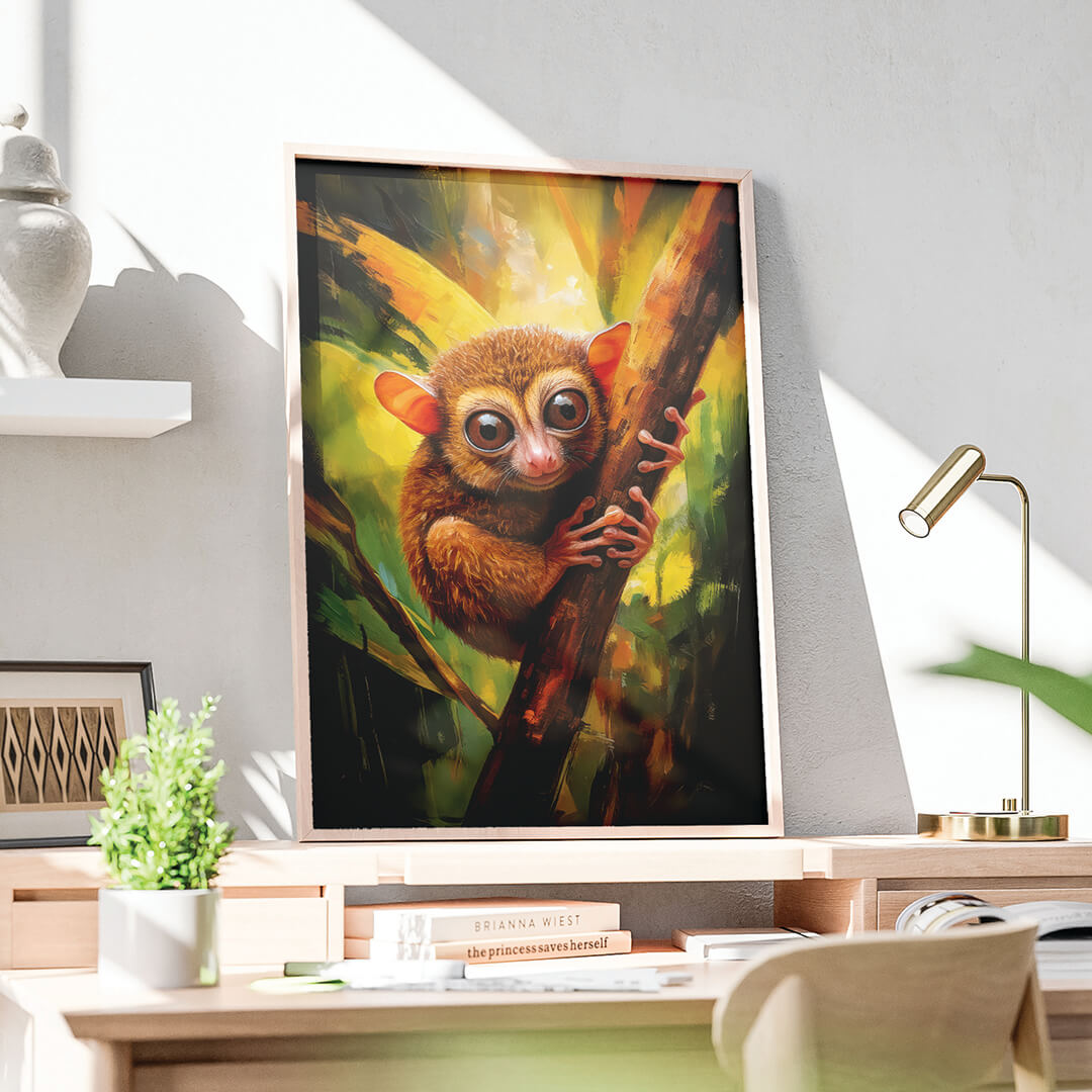 Often hidden in the underbrush and tree hollows, the tarsier is a quiet guardian of the night and a living link to the ancient evolutionary past. This piece of artwork featuring the tarsier offers more than charm—it promotes awareness and protection for this near-threatened species and its fragile habitat.